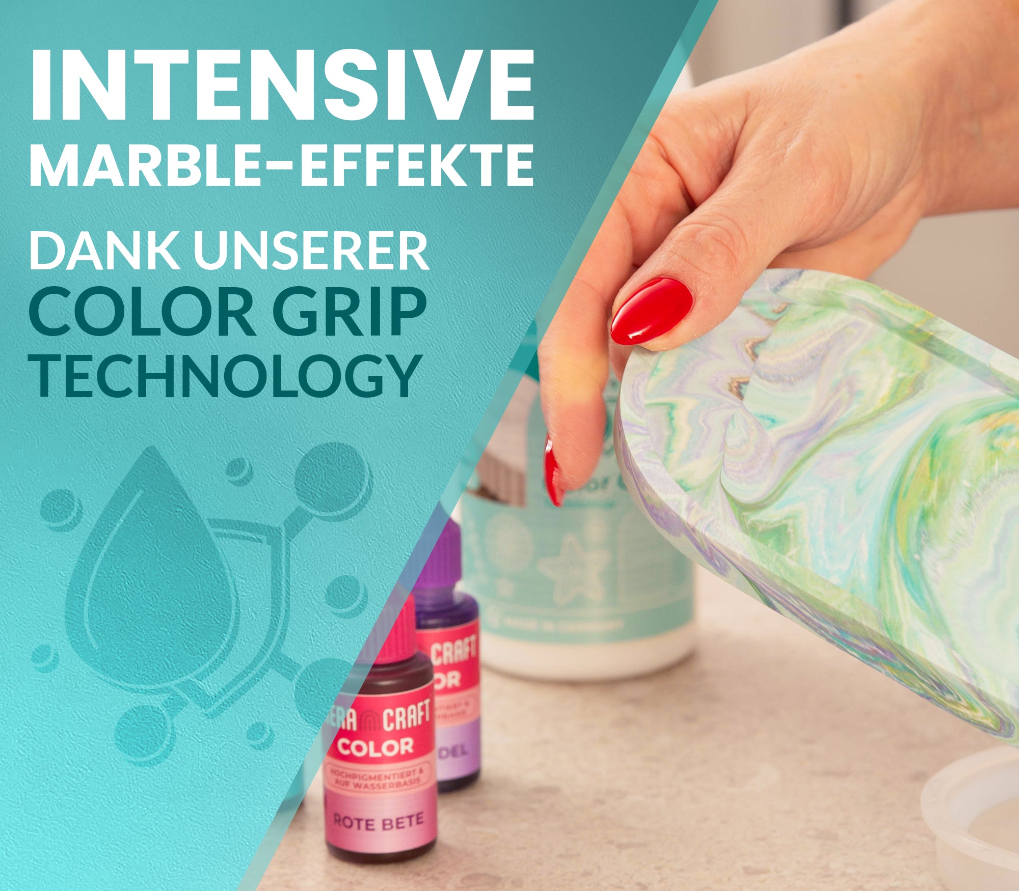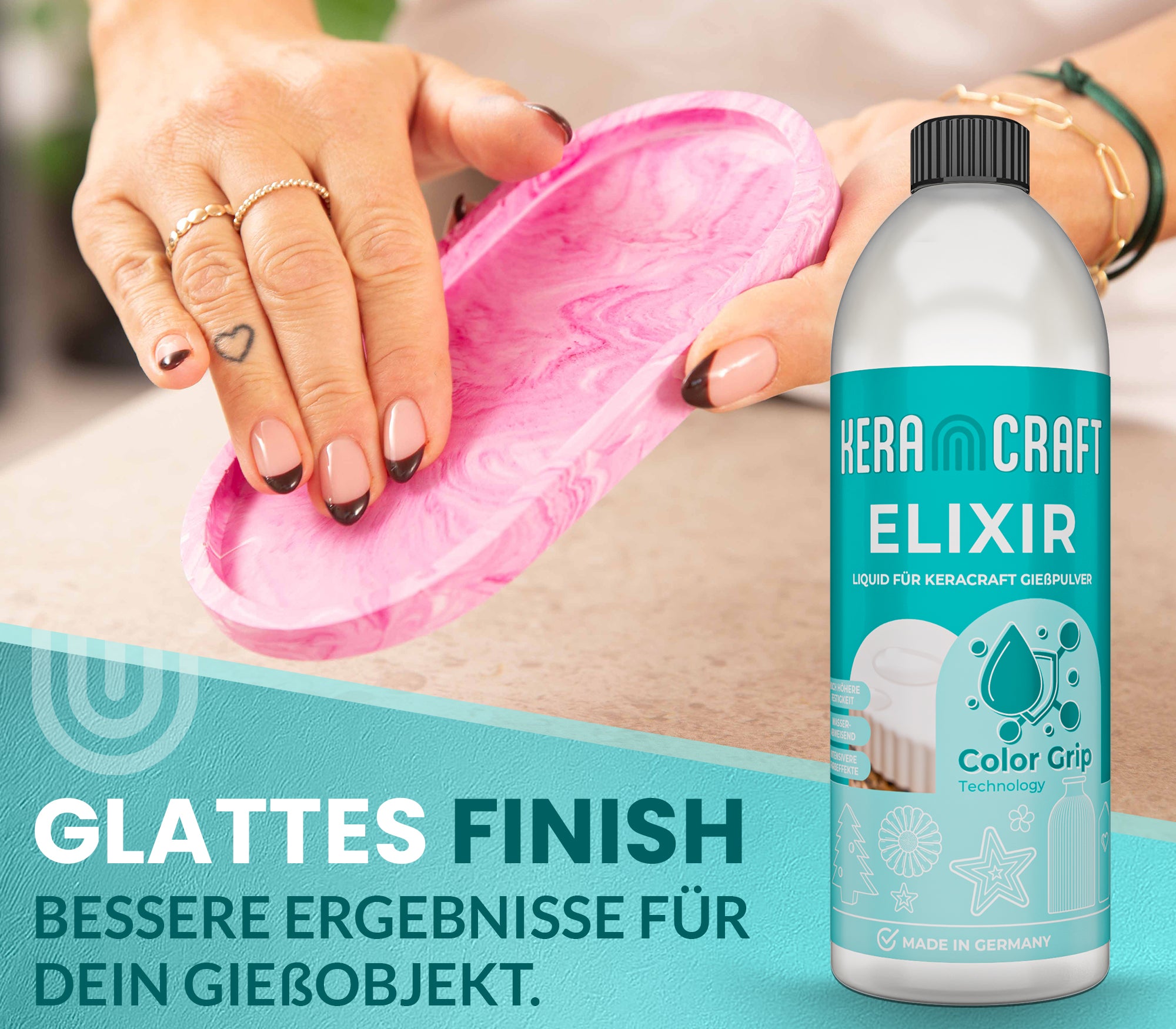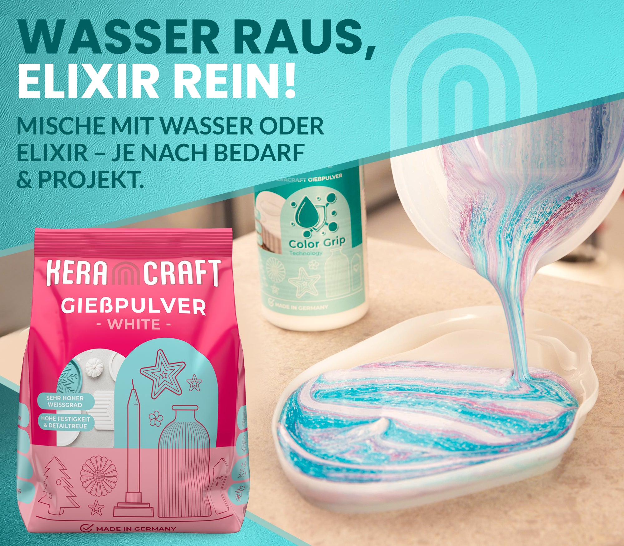 Elixir wird mit dem unserem Keracraft Gießpulver angemischt. Es wird kein zusätzliches Gießpulver benötigt.